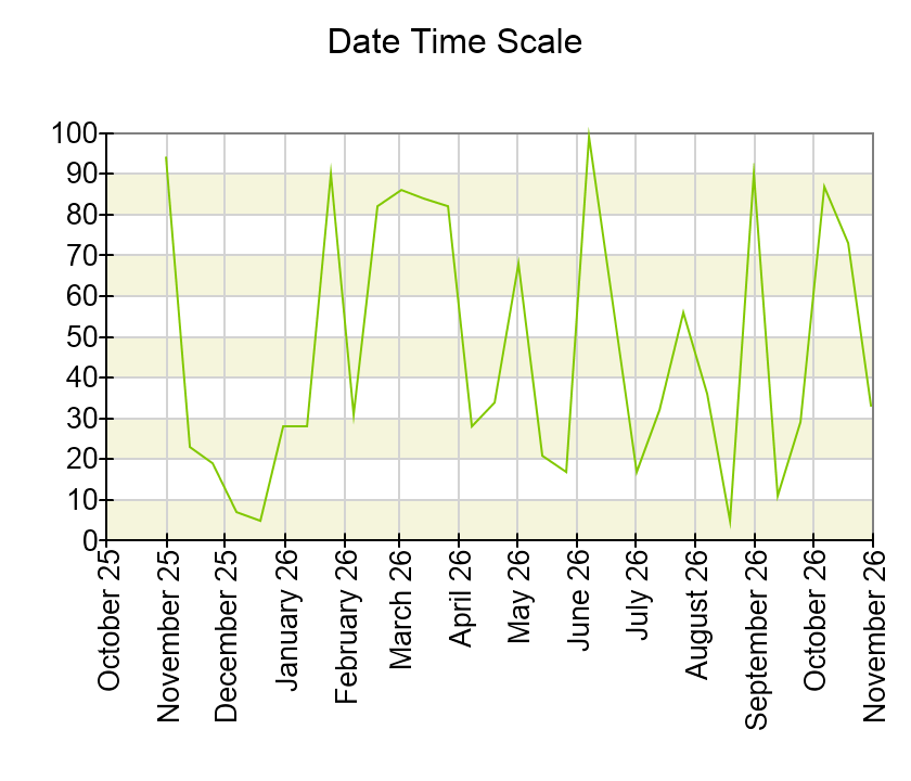 The date time scale is a type of scale that annotates a range of time using a step comprising one of the common date time units (second, minute, hour, day, week, month etc) and a multiplier. It is commonly to plot data sets that tracks a measurement over time - for example temperature over a span of one year. The following picture shows a date time scale, that decorates a span of one year using a step of one month and Month name/Year formatting: