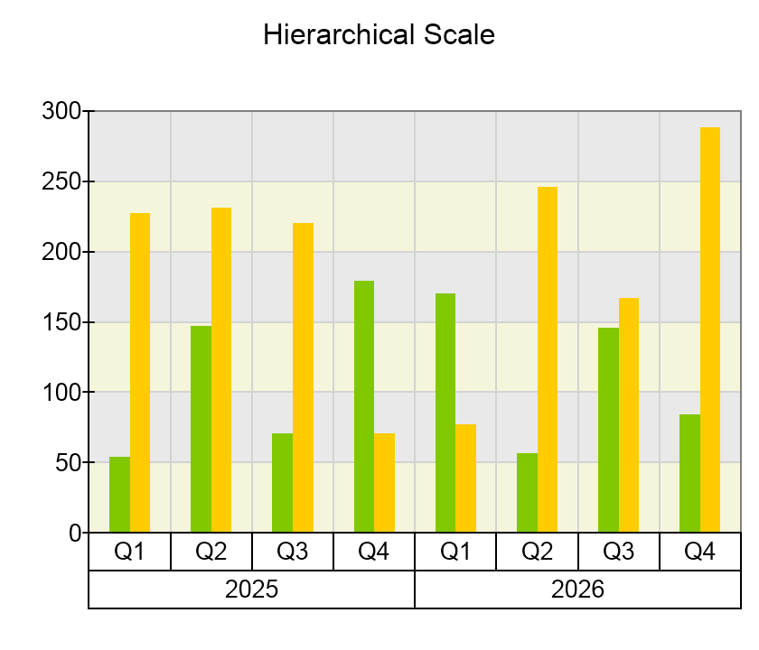 NHierarchicalScale scale = new NHierarchicalScale(); chart.Axes[ENCartesianAxis.PrimaryX].ScaleConfigurator = scale; for (int i = 0; i < 2; i++) { // create a node representing the year string yearName = (i + 2025).ToString(); NHierarchicalScaleNode yearNode = new NHierarchicalScaleNode(0, yearName); yearNode.LabelStyle.TickMode = ENRangeLabelTickMode.Separators; scale.ChildNodes.AddChild(yearNode); for (int j = 0; j < 4; j++) { // create nodes representing the quarters within the year string quarterName = "Q" + (j + 1).ToString(); NHierarchicalScaleNode quarterNode = new NHierarchicalScaleNode(3, quarterName); quarterNode.LabelStyle.TickMode = ENRangeLabelTickMode.Separators; yearNode.ChildNodes.AddChild(quarterNode); } } scale.CreateSeparatorForEachLevel = true; |