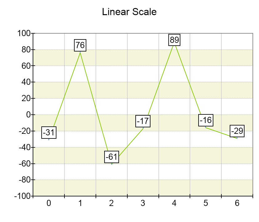 You create a linear scale by creating an instance of the NLinearScale class. The following code shows how to create a linear numeric scale and assign it to the primary Y axis of a Cartesian chart: