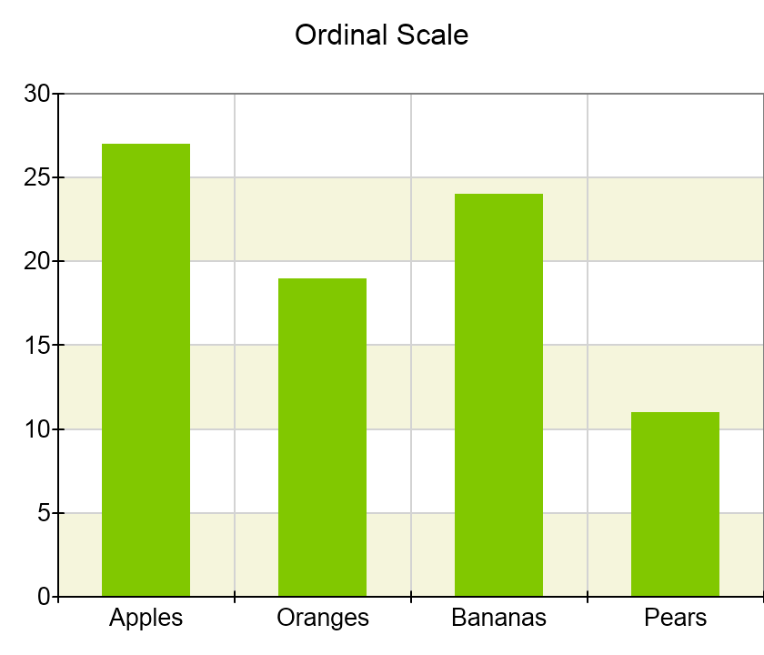 NOrdinalScale ordinalScale = new NOrdinalScale(); NList<string> labels = new NList<string>(); for (int j = 0; j < dataItemsCount; j++) { labels.Add("Category " + j.ToString()); } ordinalScale.Labels.TextProvider = new NOrdinalScaleLabelTextProvider(new string[] { "Apples", "Oranges", "Bananas", "Pears"}); m_Chart.Axes[ENCartesianAxis.PrimaryX].Scale = ordinalScale; |