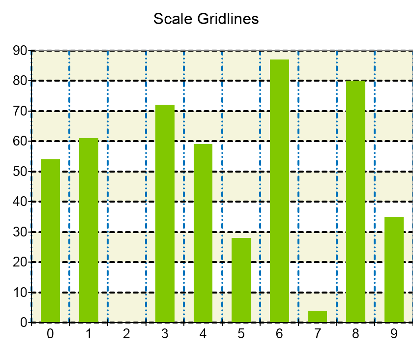 The appearance of the grid lines is controlled from the Stroke property of the NScaleGridLines object. The following code changes the appearance of the grid lines: