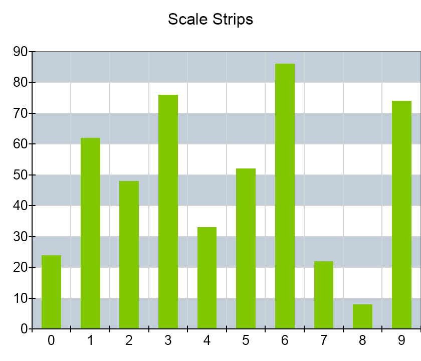 Strip lines like grid lines appear on the chart or gauge plot and are primarily used to display repeating ranges. The following image shows a chart with an interlaced strip applied on its Y Axis:
