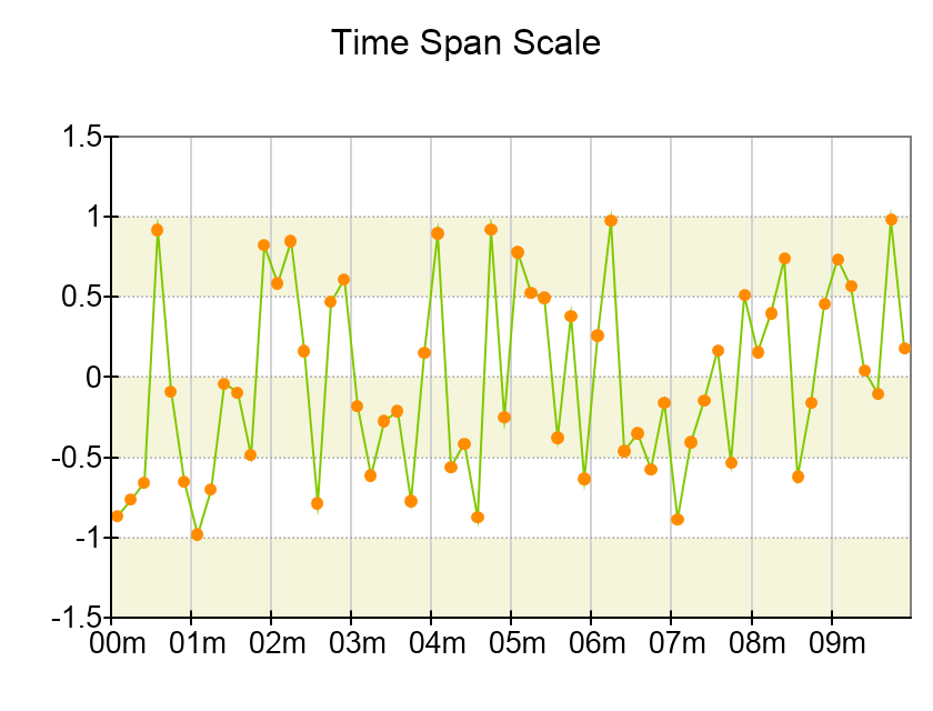 The time span scale is used when you need to display time duration which is not necessarily linked to specific date or when the date information is not relevant to the data being plotted. The timespan scale is similar to the date/time scale with the exception that it only uses time units when generating the scale ticks (time units include the Tick, Millisecond, Second, Minute, Hour, Half Day, Day, and Week units). The following image shows a time span scale:
